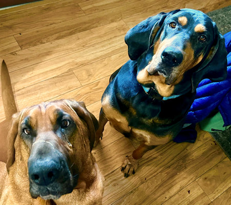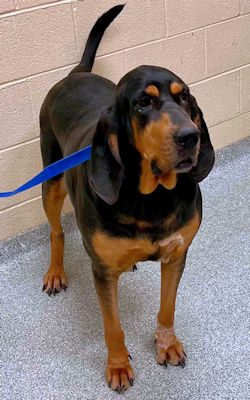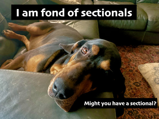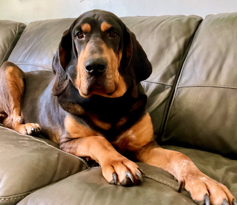 Aliza means "joyful" and this 5 year old girl would love to show you just what "wiggly happy" means. Aliza does everything with enthusiasm, including napping. She is very sweet and affectionate with people and wants to be with her humans, but may be too much dog for small children. Aliza enjoys exploring the outdoors and wrestling with the resident Bloodhound. Aliza is enthusiastic about car rides and has not had any issue with carsickness or nervousness. She has a lovely, bass voice, but uses it sparingly. Aliza is cratetrained and housetrained and sleeps quietly in her crate at night. She walks best with a Gentle Leader but will need more practice staying calm when meeting other dogs on her walk. Currently weighing about 105 lbs, she is working on becoming more fit. Aliza is being fostered near Asheville; sectional sold separately.