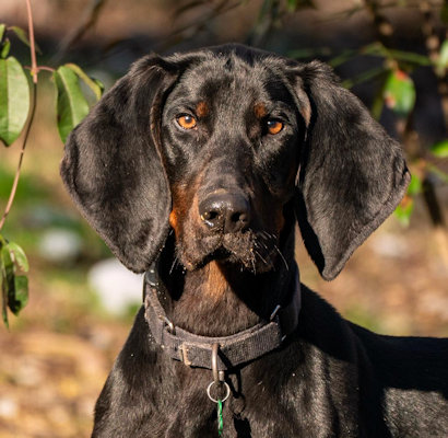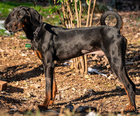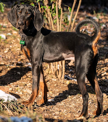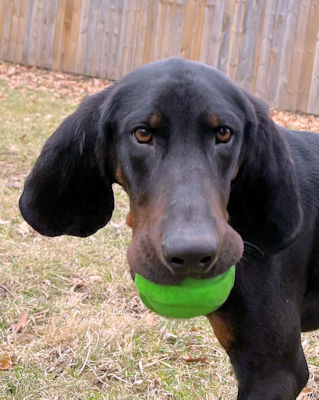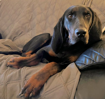 Disco is a 1 year old Black and Tan Coonhound boy waiting in north central Illinois to meet his new family after being picked up as a stray. Disco is still a very playful pup and enjoys meeting new friends at the dog park. He weighs about 45 lbs but will fill out more as he matures. Disco already knows "sit" and is housebroken. He loves toys and playing with the other dogs in his foster home. He also enjoys cuddling and, of course, following his nose wherever it leads. Disco rides well in the car and commonly spreads out on his bed to sleep for the whole trip. He walks well on a leash and makes a great hiking companion. He follows his foster mom everywhere in the house when he's not following on the heels of his hound sister. This handsome guy is going to bring one lucky family a lot of joy and laughter.