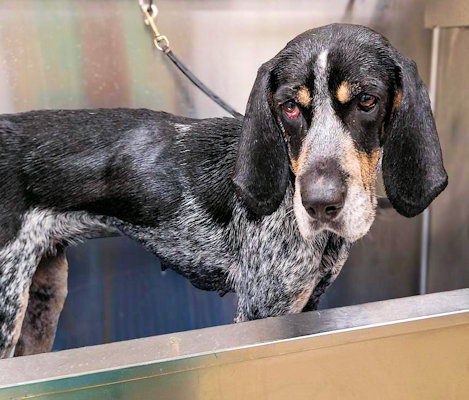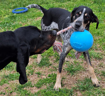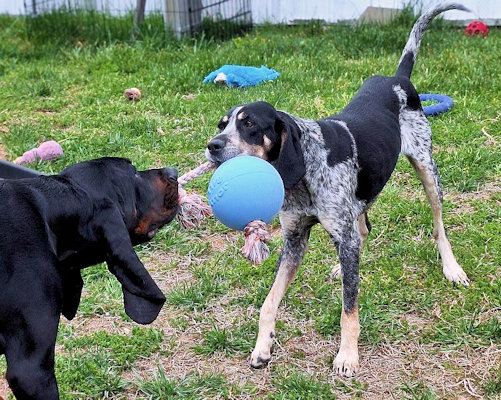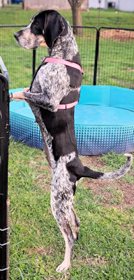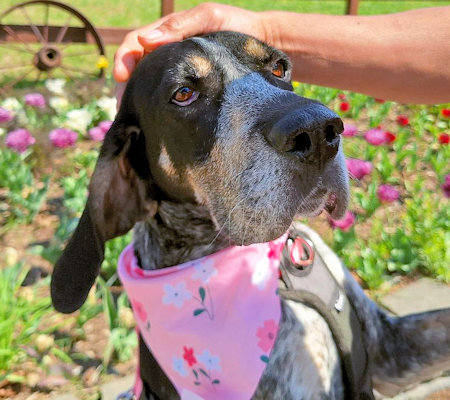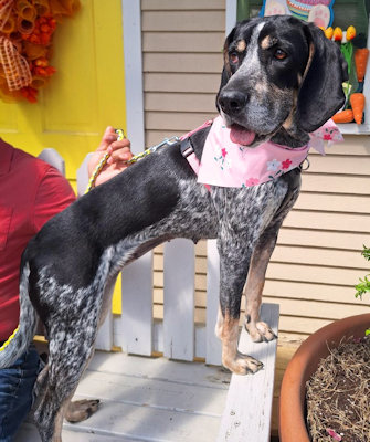 Genna is a petite 2 year old bluetick girl waiting in the St. Louis area for a new home. As soon as she arrived in her foster home, Genna's aloof and avoidant personality changed completely; she zoomed around the house, smelling everything with a wagging tail, eager to be petted and accept treats. She has the same reaction to new people: initially cool then warms up fast. In good weight at 43 lbs, she is housetrained and will whine at the door to go outside. Her foster mom is introducing her to cratetraining. Genna doesn't pull excessively on leash until there is a really good smell she wants to reach. She perks up when she sees another dog on her walk but doesn't try to go towards the dog or bark. After slow introductions, Genna enjoys playing with other dogs; she and the resident coonhound are now best friends and race around the yard playing with chews and toys. Genna seems quite happy to share, and they switch back and forth playing keep-away. When she makes her boundaries known, it does not escalate. She has also shown no signs of resource guarding so long as the other dog does not try to get into her food bowl. She is calm and has very good manners in the car.