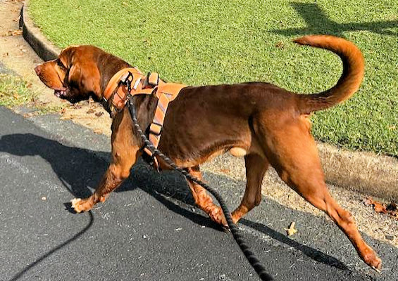 Gus is a 4 year old Bloodhound waiting in Richmond for a new home. In good weight at 75 lbs, this handsome boy is great with children of all ages. He currently lives with a large Doodle male and a bossy female herding dog and is unbothered by either. He is a little too enthusiastic in the opinion of the resident cat, but not aggressive. Gus is cratetrained and housetrained and rides well in the car. He loves to go jogging, too. Gus likes to lounge around the house, but will bark at other dogs that walk past.