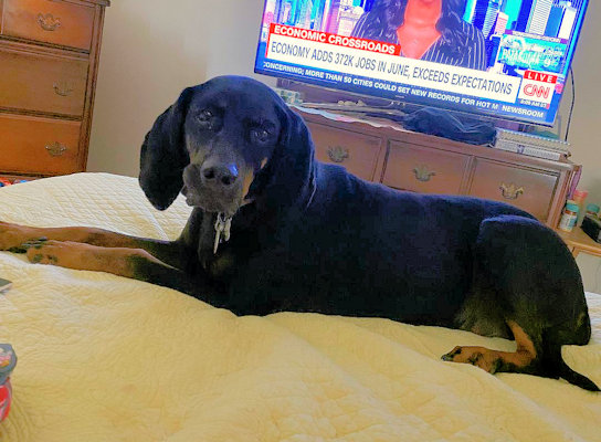 This is Polly on the foot of my bed. We are in love with her. She was easy, so easy, to get her to use the doggie door. We took her to our vet, who was quite taken with her. He was checking her throat and she was licking his ear. His exact words were, "Y'all sure did hit the jackpot with this girl!" She has done well with the cats. She is terribly affectionate and loving. She's smart as a whip and, yes, has us well trained. The more I read about her, she is as described by those who write specifically about Black and Tan Coonhounds. Now, she has behaviors that we are working on. I remembered you saying that at her age, she may be harder to train. As of yet, I haven't contacted a trainer. She has puppy traits, the trash cans, jumping up, the usual.