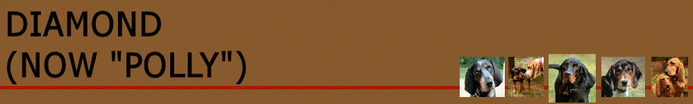 I will never be able to find the words to thank you for Polly. She is such a blessing to me and David is as crazy about her (almost) as I am. My psychiatrist was just thrilled and wants me to take her with me when I have an appointment. The doc herself has 3 dogs and knows how much Polly has helped me with my depression. My friends are wild about her, I am finding that people LOVE hounds, just never occurs that they are precious pets. Polly is great with our 7 year old grandson! He has not been comfortable with dogs, but, of course, she immediately began following him around and he giggles, gives her treats, etc. She does love to dig, we had an electric fence put in, which stopped her climbing over the fence to chase whatever she can find.