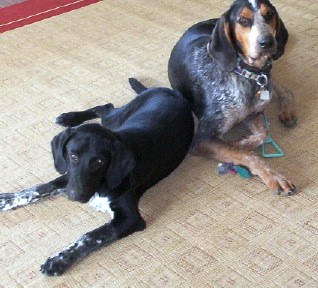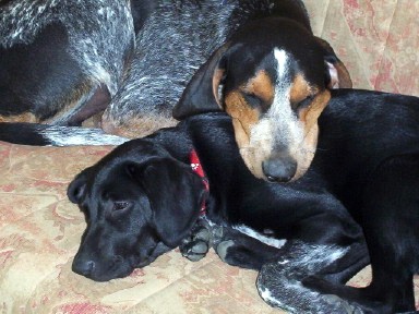 I thought you might like an update on these two, now named Finnegan and KayLee. They are both doing great. They have 8 acres fenced to run and play. He is very tolerant of her antics. She is very laid back and just loves to cuddle. Their training is coming along very well. They are both very smart and willing to please. I purchased this book "The Loved Dog" by Tamar Geller. It is how to train in a playful non- aggressive way. It has turned the whole training process into a lot of fun for us all. They love going for rides and walks, Finn is walking very nicely on a leash now. They both sleep with us, a little crowded as KayLee is growing. She is 34 lbs now.
