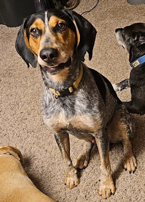 Mr. Diego Blue is housetrained and cratetrained, knows a few basic commands, and is a quick learner that is very treat motivated. He gets along great with the other dogs in his foster home and would be happiest in a new home with at least one doggie playmate. He has also proven to be respectful around livestock like sheep, goats, chickens, and ducks. He has not been cat-tested. He is not as vocal as most hounds but can be chatty when he is asking for playtime. He likes wading in water and loves to play with other dogs but also knows how to relax and lounge inside when the fun is done.