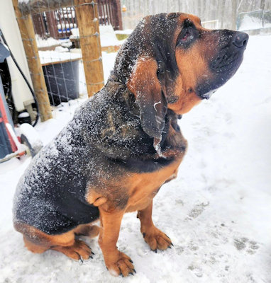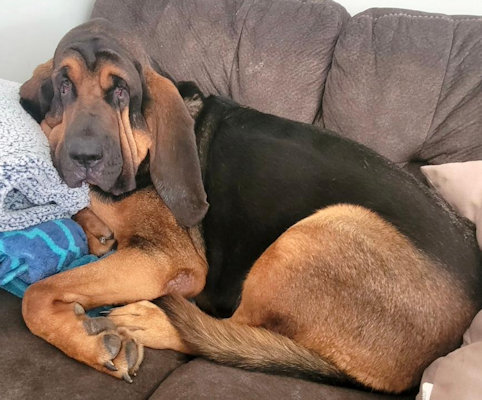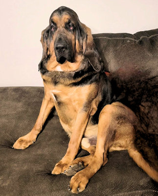 Merle was born on March 11, 2018 and is waiting in the Columbus area for a new home. Weighing about 135 lbs, Merle is great with dogs, cats and children. He is housetrained, cratetrained, leashtrained and e-collar trained. He has a loving and affectionate personality and enjoys going for walks and runs. Merle is a perfect car rider, too. Like all Bloodhounds, Merle needs to be fed separately.