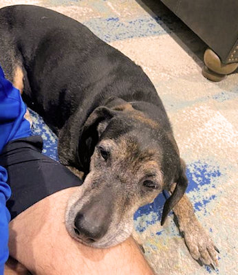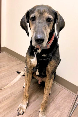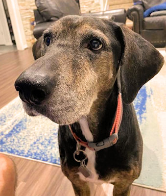 Midas is a 10 year old Coonhound mix waiting in the Dallas area for a new home. He was adopted as a young adult and is being returned because he is very uncomfortable with the noise and activity of the household's toddlers. He would be best with a family with older children (7 years of age or older) who understand when a dog wants to be left alone. Midas would also be happiest as a solo dog; NO cats, please. He is reliably housetrained and has free run of the house when left alone. Midas does know how to walk on a leash, but he likes to pull some in areas that he knows. His personality is best described as an old man that wants to just lay around and be lazy by himself all day, unless the blinds are open and he can look for other dogs and people walking past the house. He loves to cuddle on a couch or bed with a person and a blanket. He gets extremely excited about car rides. In good weight at 68 lbs, Midas does like to bark at other dogs or people walking by the house, or when he is playing.