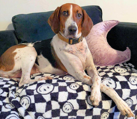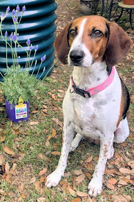 Okra is a 4 year old Treeing Walker girl waiting in Tallahassee for a new home. She is a sweet mix of active dog and couch potato; she likes to run but also cuddle up and nap. Okra is great with children and male dogs and is untested with cats. She is reliably housetrained and has free run of the house when left alone. Okra is an excellent running partner on leash and has had training to learn commands. She is very vocal when she wants to be but can also be quiet as a mouse.