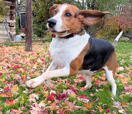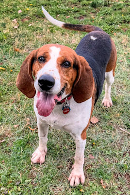 Oscar is an 8 year old Treeing Walker boy that could easily be your dream dog. From the moment he wakes until the moment he goes to bed, his tail is wagging. He LOVES to swim, take leisurely walks, ride in the car, visit friends or go to the office; he just enjoys being a hound about town. Oscar is a popular boy at doggie daycare and is described as "kind, quiet, and respectful." He is cratetrained, housetrained, walks well on a leash, and speaks only when he has something really important to say. Oscar is good with dogs and cats and is patient and loving with children. He would love a home where he could get lots of attention and love, regular daily exercise, and be allowed to snuggle up to his humans. Oscar had a severely broken leg at some point in his past, so he will not be your running companion or backcountry hiking buddy, but this boy loves a good long walk and does well on short hikes. He will swim until you make him get out of the water. In good weight at 75 lbs.