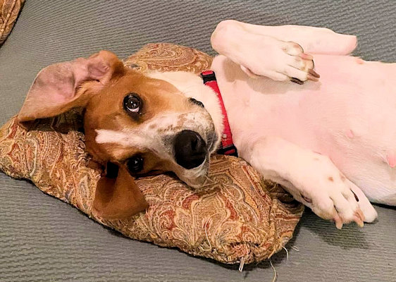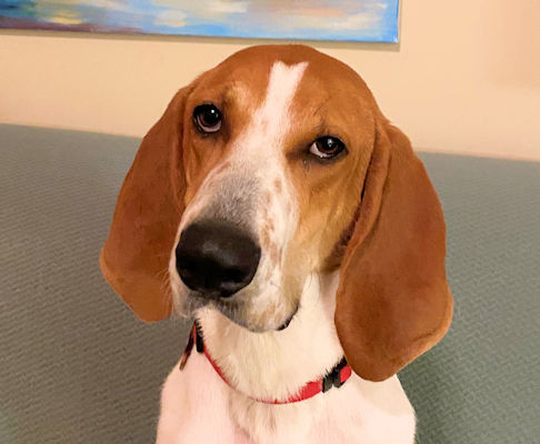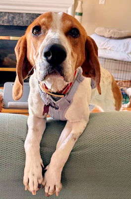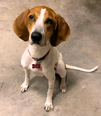 Roxy is a 2 year old female English Coonhound waiting in Burlington for a new home after being found as a starving stray. She is now happy and healthy, weighing around 50 lbs. She sleeps in an unlatched crate at night, is housetrained, and enjoys playing with a smaller female dog at her foster home. Roxy is untested with cats. Roxy rides well in the car and enjoys her walks.