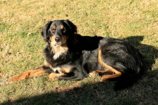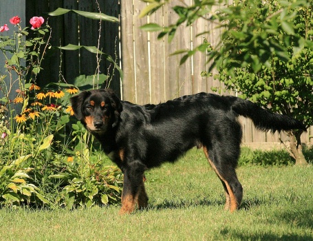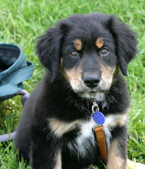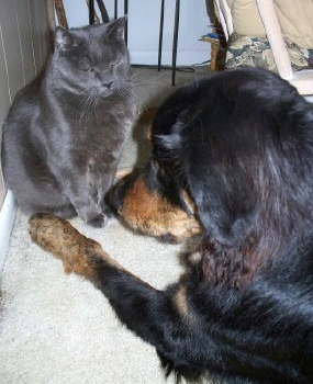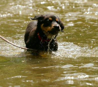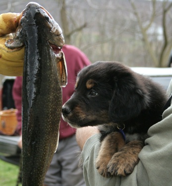 I'm doing very well with my new family. I get lots of things to chew on so I will leave the shoes alone. I sneak a sock or a flipflop every now and then though. I LOVE the water. I go swimming in the creek almost every day when we walk in the woods. I have seen lots of deer and want to chase them real bad. I can howl real good now. I only do that when I'm startled or someone knocks on the door. Oh, my big brother, Barnham (the kitty), is getting used to me finally. He let me lick his head yesterday. But, when I ask him to play with me he runs upstairs where I'm not allowed yet. My best buddy is Ralph. He is a 90 lb Bernese Mountain pup (yup, pup). He is very nice and we share treats. Oh, and I now weigh 62 lbs.